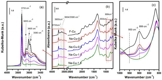 Figure 3 shows the ex situ DRIFTs results of the fresh sample with those of Na-impregnated ones. The IR bands in the 3500–3800 cm−1 region were related to the stretching vibration modes of OH groups (–OH) [2,12,19]. IR bands at 3733 cm−1 corresponded to isolated silanols (SiOH) and at 3655 cm−1 to [Cu(OH)]+ [2]. Two strong bands at 3604 and 3580 cm−1 were assigned to the Brönsted OH groups as (Si-O(H)-Al) [2,12,19]. Moreover, the 1000–800 cm−1 region in the IR corresponded to a framework T–O–T vibration that was perturbed by the presence of exchanged Cu ions. The bands at 950 and 900 cm−1 were associated with an internal asymmetric framework vibration perturbed by two types of copper cations ([Cu(OH)]+ in 8 MR and Cu2+ in 6 MR) [5,20,21].