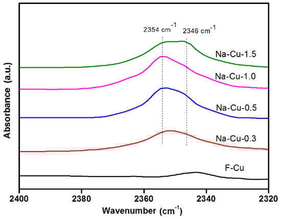 To probe the Na existing state, CO2-DRIFTs tests were performed, and the results are shown in Figure 4. Two IR bands at 2354 and 2346 cm−1 were assigned to the vibrations of CO2 interacting with Na+ ions on exchange sites on catalysts [11].