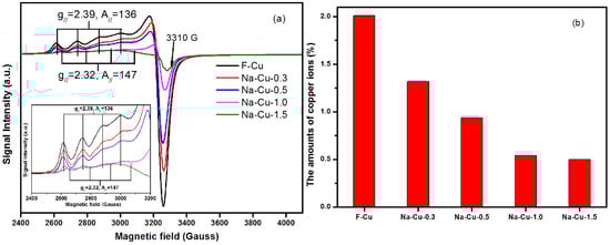Figure 5b compares the number of Cu2+ ions on the Na impregnated Cu/SSZ-13 catalysts from EPR spectra using the standard CuSO4 solution as a reference. The number of Cu2+ ions decreased in the following order: F-Cu (2.01%) > Na-Cu-0.3 (1.32%) > Na-Cu-0.5 (0.94%) > Na-Cu-1.0 (0.54%) > Na-Cu-1.5 (0.50%). Notably, since Cu2+ ions in CuAlOx species have an EPR signal [11,24,25], the number of Cu2+ ions over Na-Cu-1.5 contained both the amounts of Cu2+ ions left and Cu2+ in CuAlOx species.