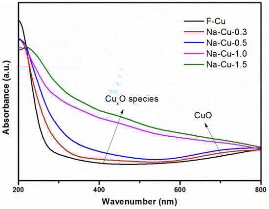 To further prove the variation of different Cu species amounts on catalysts, UV-Vis DRS spectra, a qualitative generic analysis method, was used and the results are shown in Figure 7. The band centered at 205 nm was assigned to the oxygen-to-metal charge transfer related to Cu2+ ions [9,15]. The 300–600 nm region was attributed to transitions in CuxO, such as charge transfer transitions in O–Cu–O and Cu–O–Cu [4,31]. In addition, the region between 600 and 800 nm was assigned to the electron d–d transitions of Cu2+ in distorted octahedral surrounding by oxygen in CuO particles [9,15].