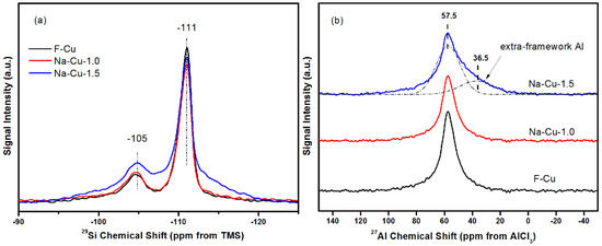 To comprehend the effect of Na ions on the CHA structure, the chemical environmental of 29Si and 27Al on Na-Cu-1.0 and Na-Cu-1.5 were compared to those of F-Cu in Figure 10. F-Cu, the fresh catalyst, presented two framework Si features, assigned to Si(3Si, 1Al) and Si(4Si, 0Al), at −105 and −111 ppm, respectively, as well as one framework Al feature at 57.5 ppm [3]. However, the spectroscopy pattern changed when Na loading increased up to 1.5 mmol/g (Na-Cu-1.5). The peak of 29Si NMR spectra became broad due to the breakage of Si–O–Al bonds and formation of amorphous silicon complexes, which resulted in the non-horizontal baseline XRD pattern of Na-Cu-1.5 [32]. Meanwhile, the 27Al NMR spectrum (Figure 10b) shows non-framework Al centered at −36.5 ppm [13], which illustrates the dealumination process and broken Si–O–Al bonds.