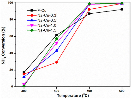 The results above reveal that the reduced Cu2+ ions caused by Na introducing transformed to other copper species (CuxO, CuO, and CuAlOx species). To further prove this variation regulation, NH3 oxidation over all catalysts are shown in Figure 11. Olsson and Lerstner [33,34] have pointed out that NH3 oxidation at low temperature (≤300 °C) occurs on Cu2+ ions in 6 MR, while [Cu(OH)]+ in 8 MR and copper oxide species were responsible for NH3 oxidation at a higher temperature (>400 °C). At 300 °C, the NH3 conversion of Na impregnated catalysts was lower than that of F-Cu and NH3 conversion showed a decreasing trend with increasing Na contents, which confirmed the decreasing amounts of Cu2+ ions in 6 MR. When the temperature was higher than 400 °C, CuxO and CuO improved the NH3 conversion on all impregnated catalysts, because the NH3 oxidation reaction could easily occur on copper oxide species. Based on all the conclusions above, the deactivation mechanism of Na on Cu/SSZ-13 is proposed in Scheme 1.