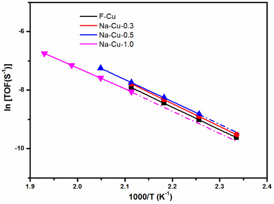 Based on the conclusions above, the impregnated Na’s impact on NH3-SCR reaction (at low and high temperature) can be addressed. According to Ea measurement results, four catalysts—F-Cu, Na-Cu-0.3, Na-Cu-0.5, and Na-Cu-1.0—had the same Ea value, suggesting the same NH3-SCR reaction mechanism. Therefore, as shown in Figure 12, the turnover frequencies (TOFs) of these four catalysts were calculated based on their reaction rate and the number of Cu2+ ions from the EPR results (Figure 5). The identical TOFs for F-Cu, Na-Cu-0.3, Na-Cu-0.5, and Na-Cu-1.0 illustrate that the Cu2+ ions were the active sites for NH3-SCR reaction at kinetic temperature region and the existing Na ions could not influence the nature of the remaining Cu2+ ions that were not occupied by Na+.