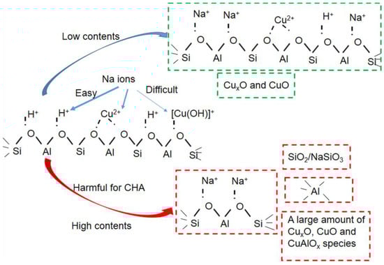 In recent years, some studies have also considered the Na ions’ effect on Cu/SSZ-13 catalysts, but most of them focused on co-cation Na ions. Gao et al. [12] investigated the effects of co-cation Na on Cu/SSZ-13 catalyst. They found ≈1.78% Na promoted SCR performance at low temperatures and helped to improve the hydrothermal stability of Cu/SSZ-13 because Na ions modified the redox of active sites and protected the framework of CHA structure. Zhao et al. [13] found a high amount of co-cation Na ions decreased the hydrothermal stability of Al-rich Cu/SSZ-13 at 750 °C for 5 h because the excess amount of Na ions weakened the interaction between Cu ions and the zeolitic framework and formed CuxO species. Xie et al. [14] found one-pot-synthesized Cu/SSZ-13 with higher co-cation Na contents showed poorer hydrothermal stability at 750 °C for 16 h, which was attributed to Cu species with poor stability and CHA structure deterioration. Even though some achievements have been made on co-cation Na, the conclusion could not be applied in real-world applications because co-cation Na ions have already existed before Cu exchange and could not represent the deposition of Na in the real-world. As far as we know, few studies have investigated the effect of impregnated Na on Cu/SSZ-13 catalysts. Fan et al. [15] studied the impregnated alkali and alkaline metal effect on Cu/SSZ-13 after hydrothermal aging. They found less of a decrease of SCR activity in 0.5 mmol/g Na-impregnated samples compared with fresh Cu/SSZ-13 when samples were hydrothermally treated at 700 °C for 12 h. However, the tolerance to Na ions and the overall influence could not be obtained because only one impregnated sample was shown. Therefore, the effect of impregnated Na on Cu/SSZ-13 should be further studied.