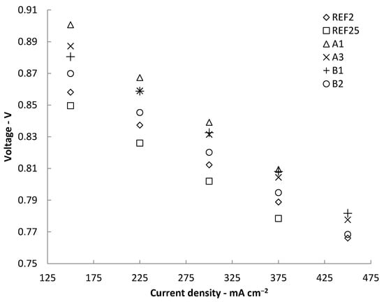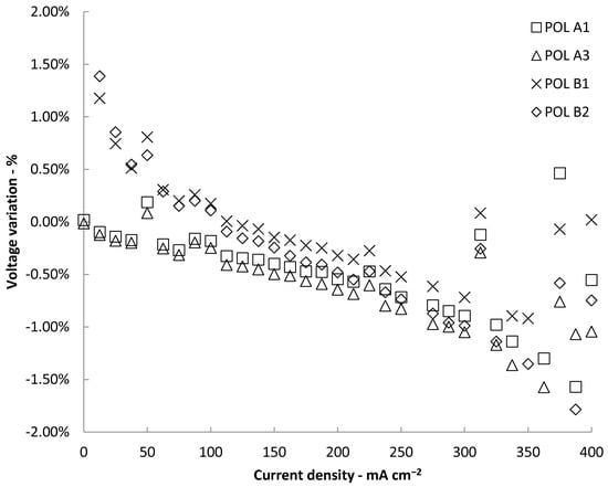 Figure 7 reports the result of such analysis. Values are reported, for each current density, as percentage decay of voltage average with respect to the reference polarization performed after the start-up. Negative values indicate voltage degradation, while positive ones indicate an increase in performances.