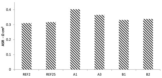 Figure 2. It is interesting to note that we have a different indication compared to voltage values. Dry reforming compositions, in fact, have higher ASR values, i.e., higher losses, if compared to steam reforming ones, even if the differences are minimal. A possible explanation, already discussed elsewhere [