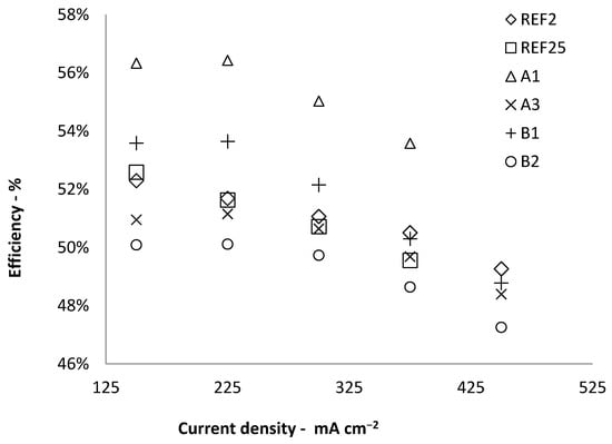 Figure 4 reports stack efficiency for each investigated composition. Efficiency is calculated as follows (4):