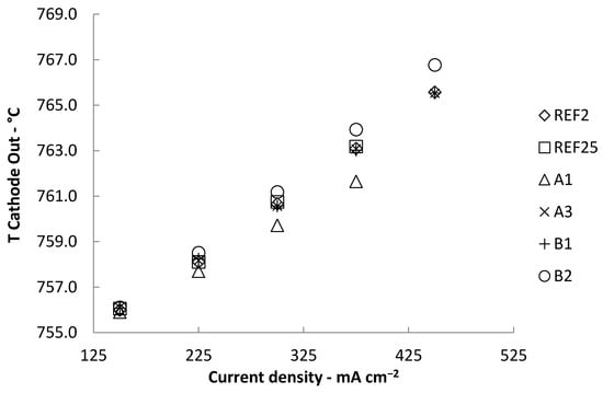 Figure 6. Cathodic temperature is related mainly to air flow and, therefore, current density: air flow is the same for all compositions. This means that the variation is mainly related to the power losses during operation. With the increase of current density there is an increase in temperature and, even if utilization of oxidant is very low, air variation does not completely compensate the internal thermal losses. From minimum to maximum current density there is an increase of 10 °C in temperature. The effect of composition is very low and only A1 and B2 mixtures exhibit a difference coherently with the voltage trends.