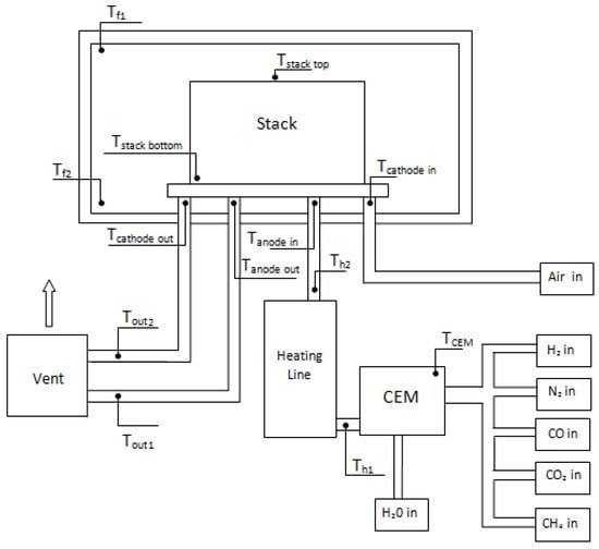 24]. No thermocouple could be placed inside the stack, but two thermocouples are located in the furnace close to the stack. Moreover, four additional thermocouples are placed inside the pipes, specifically two in the inlets, anodic and cathodic, and two in the outlet, anodic and cathodic.