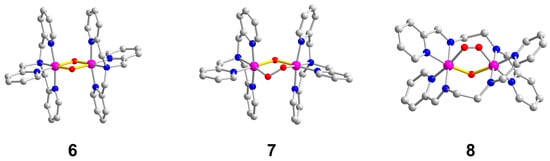 By reacting of the Schiff base ligand, N,N-bis(pyridin-2-ylmethylene)ethane-1,2-diimine (L4), and Co(ClO4)2 in excess of pyridine the binuclear complex [(L4)CoIII(µ-OH)(µ-O2)CoIII(L4)](ClO4)3 (8) has been prepared []. The structure of its core is similar to that observed for 7 (Figure 3). The light-driven water oxidation activity was studied by the independent group of authors, revealing TON values and oxygen concentrations much higher than those for 7 (Table 1). However, the tests performed in the presence of bpy ligand showed complete suppression of the catalytic activity with five equivalents of bpy (7b, Table 1), indicating that the observed activity could be associated to the free cobalt cations, rather than complex 7.