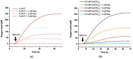 Accumulations of the oxygen in the course of water oxidation catalyzed by complex 7 (a) or Co(ClO4)2 (b), in the presence of various amounts of bipyridine (bpy) chelating agent. Adapted with permission from [], American Chemical Society, 2016.