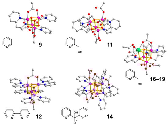 A series of cubane cobalt Co4O4 (14) and mixed-metal Co4−xNixO4 (15) complexes having bipyridine-like ligand was reported in 2017 []. The base complex [CoII4(L6)4(OAc)2(H2O)2](ClO4)2 (14) was prepared starting from the pro-ligand di(2-pyridyl)ketone, which is hydrolyzed to produce the ligand L6 (Figure 5). Complex 14 revealed moderate activity in the water oxidation with maximum TON of 96 (Table 1) at pH 8.5. In general, the catalytic parameters exhibited by 14 are close to other cobalt cubane complexes (9–13). No nanoparticles formation was observed according to the DLS experiments. The possibility of significant cobalt leaching was rejected by applying the Chelex® resin able to capture free metal ions: only a negligible drop of catalytic activity was observed in the case of 14, while a simple cobalt salt showed 66% suppression caused by the resin trap. The presence of cobalt in the +2 oxidation state allowed isomorphic substitution of cobalt ions with nickel ones to obtain a series of Co4−xNixO4 cubane complexes with maximum x = 2.85 (not including pure nickel compound with x = 4), bearing the same structures. The catalytic activity in the water oxidation gradually dropped with the increase of nickel portion, showing the TON and TOF ca. three times lower than for pure cobalt complex. The complex Ni4O4 did not show any notable catalytic activity under the same conditions [].