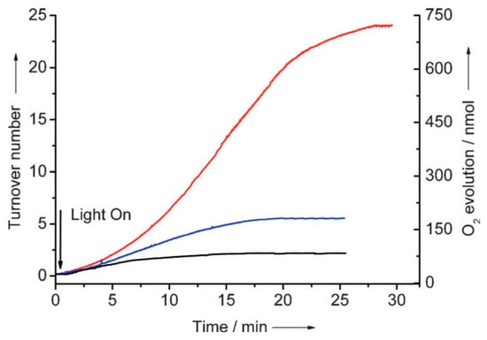 Accumulations of the oxygen in the course of water oxidation catalyzed by assemblies {Co4O4(OAc)3(Py)4}{(L7)Ru(bpy)2} (20a, blue line) and {Co4O4(OAc)2(Py)4}2{(L8)Ru(bpy)2}2 (21, red line), as well as the equimolar mixture of [Co4O4(OAc)3(Py)4] and [Ru(bpy)3]Cl2 (20b, black line). Complex [Co4O4(OAc)3(Py)4] is equivalent to 9. Adapted with permission from [],Wiley, 2014.