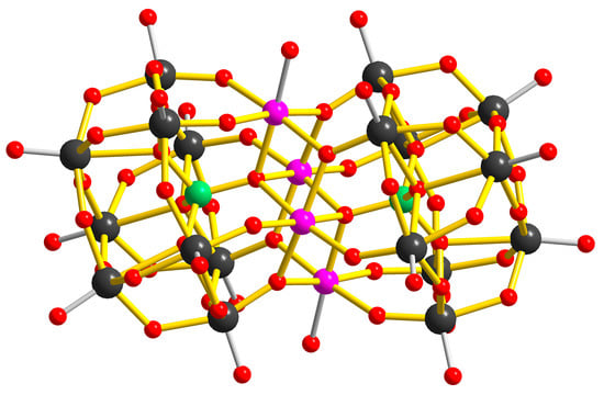 Structure of the anion of the compound 22. Color scheme: Co, pink; V, green; W, black; O, red; M–O–M bonds are highlighted by yellow.