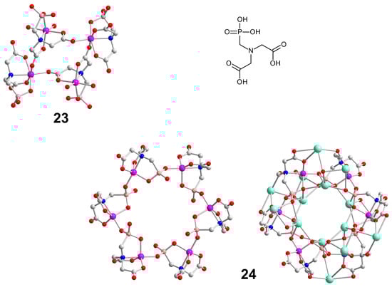Two coordination compounds [Co4(H2O)4(HL9)2(L9)2] and K12[Co(L9)]6 (23 and 24, respectively) bearing tetra- and hexanuclear structures were prepared starting from N-(phosphonomethyl)iminodiacetic acid (H4L9) as pro-ligand (Figure 8) and cobalt chloride or acetate as a metal source, respectively [,]. Complex 23 disclosed TONs up to 662 (Table 1) in the light-driven water oxidation. The standard set of experiments (UV-Vis and comparative DLS tests of 23 and cobalt nitrate pre-catalyst) were applied to confirm that no nanoparticles were formed after light-driven water oxidation using catalyst 23 []. Moreover, a set of extractions with following ICP–MS (inductively coupled plasma mass spectrometry) and CAdSV (catalytic adsorptive stripping voltammetry) experiments were performed, indicating that less than 0.35% of catalyst 23 released free Co2+ ions in the buffer solution. One may notice that cobalt nitrate, as pre-catalyst under the same conditions, showed TON of 150 (for [Co2+]0 = 2 µM). This value is even higher than that exhibited by catalyst 23 if adjusted for six cobalt atoms in its molecule (TON = 110).