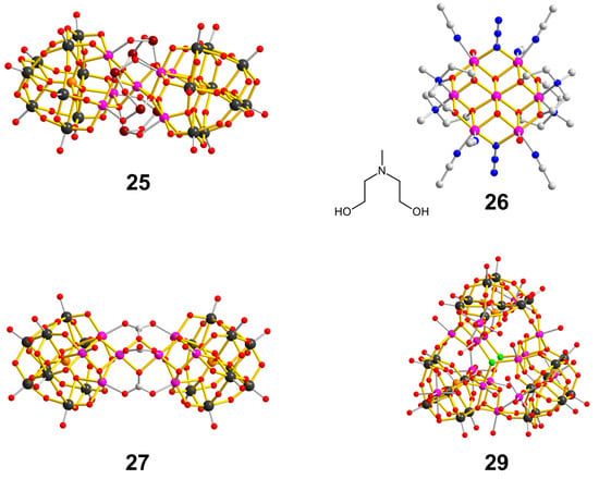 Structures of complexes 25–27, and 29 (for 25, 27, and 29 cationic counterions are omitted). Color scheme: Co, pink; W, black; As, dark red; Si, orange; Cl, green; O, red; N, blue.