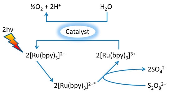 Currently, worldwide energy demand is satisfied mostly with fossil fuels, such as gas, oil, and coal [,]. Although these energy resources are rather easy to use, they contain a few principal drawbacks: limited stock, high consumption of O2 as well as high CO2 emission and, finally, high risk of environmental pollution. It is for these reasons that the search for highly efficient energy sources has been of high interest during the last decades. The use of sunlight, as an inexhaustible energy source with the ground level flux of ca. 1360 W m−2 [], is an attractive alternative to fossil fuels. The chemical approach to sunlight energy utilization is to develop photo-driven processes able to replace the existing environmentally non-friendly ones. The photosynthesis of carbohydrates from CO2 and water, occurring in natural biosystems, represents a perfect model to be studied []. The energy for this process is provided by photosystem (PSI and PSII) protein complexes, and through the formation of ATP and NADPH under visible light exposure. In brief, (for recent reviews see [,,,,,]), upon irradiation, the photosensitizer (chlorophyll) in the PSII abstracts electrons from a water-oxidizing complex (WOC). The latter oxidizes water and releases O2 to close the catalytic cycle within the PSII system. The four-electron process of water oxidation, which also produces four protons, consumes significant energy and, at the same time, is potentially attractive for practical applications when protons are reduced to H2 [,,].