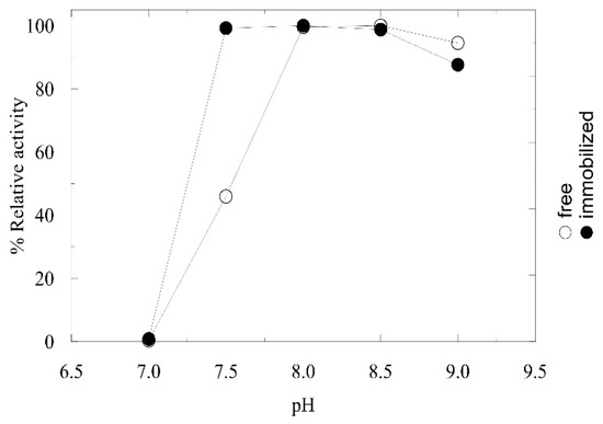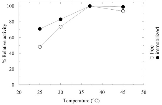 The temperature profiles (Figure 3) also showed some slight differences between the free and immobilized AMDase CEE. The optimum temperature for the immobilized biocatalyst was 37 °C, the same as in [2]; at 25 °C the activity decreased to 70% of relative activity for immobilized CEE and to 50% for the free enzyme. Higher temperatures were not tested due to the low stability of the PVA particles [25].