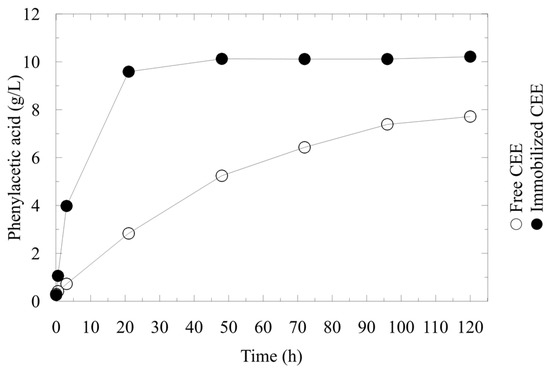 A comparative biocatalytic reaction was performed with free and immobilized AMDase (Figure 4) with 10 g/L of the substrate to see the ability of the biocatalyst to perform a complete substrate conversion. The reactions were performed using 0.82 U of both immobilized and free CEE (0.5 g of LentiKats® or 0.013 mg of AMDase CEE). Using the immobilized enzyme, the conversion reached 100% after 20 h, while with the free enzyme the conversion was not completed even after 120 h. This clearly demonstrates that the enzyme was stabilized by the PVA gel, as also observed in [32].