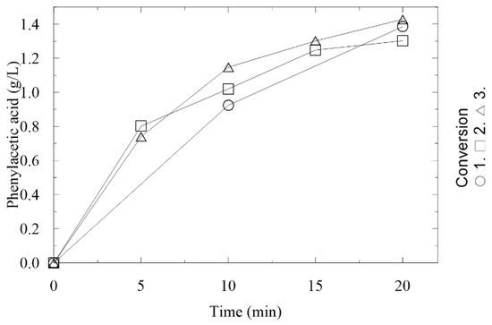 Three consecutive biocatalytic reactions with AMDase covalently bonded on magnetic microparticles. Reaction conditions: 5 mL TrisHCl buffer (100 mM, pH = 8.5), α-phenylmalonic acid 1.8 g/L, 10 mg of MMP; 37 °C and 200 rpm.