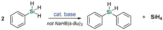 - Itoh, M.; Inoue, K.; Ishikawa, J.I.; Iwata, K. Disproportionation reactions of organohydrosilanes in the presence of base catalysts. J. Organomet. Chem. 2001, 629, 1–6. [Google Scholar] [CrossRef]