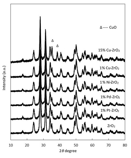 The XRD patterns of pure ZrO2 and calcined different metals (Cu, Ni, Pt, and Pd) over ZrO2, in addition to the different loadings of copper on ZrO2, are shown in Figure 1.