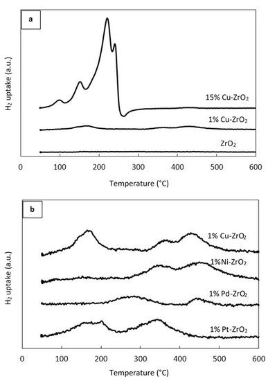 H2-TPR measurements were performed to investigate the reducibility of the different metals (Cu, Ni, Pt, and Pd) supported over ZrO2, and the dispersion of the metals on the support. The TPR profile provides information on the dispersion of the metal species over the support, and gives details of the interaction between the metal ions and the support [37], and it is well suited for studying systems with a high metal dispersion, whose characteristics are beyond the detectability limits of XRD [35]. Figure 2a exhibits the TPR profiles of pure ZrO2 and Cu supported on ZrO2. As can be seen, ZrO2 displays no reduction peaks, while 1% Cu–ZrO2 exhibits three reduction peaks centered at 176, 378, and 441 °C. Shimokawable et al. [38] and Dow et al. [39] studied the reduction behavior of Cu–ZrO2 and CuO–YSZ catalysts, respectively. They elucidated that the lower temperature peaks are because of highly dispersed CuO and/or Cu2+ ions with an octahedral environment. Robertson et al. [40] and Van der Grift et al. [37] studied Cu–SiO2 catalysts. These authors demonstrated that highly dispersed CuO species are more easily reduced than bulk CuO. Based on the literature data and the XRD results, it can be concluded that the first peak is attributed to highly dispersed CuO species, while the second and third peaks are assigned to the small CuO clusters with different particle sizes. For 15% Cu–ZrO2, it can be seen that there are four peaks. The first and second peaks at low reduction temperatures (103 and 156 °C) can be ascribed to well dispersed CuO, whereas the large peaks (third and fourth) at high reduction temperatures (223 and 242 °C) are attributed to bulk CuO. A considerable shift was observed for the high temperature peaks at a high Cu loading, likely due to the weakening of the metal–support interaction. This may be because more Cu species were located on the outer surface of the support and were easily accessible, while at the lower metal loading Cu species were highly disperse and were located in the pores of the ZrO2 support, leading to a low accessibility towards hydrogen, and a higher reduction temperature [41].