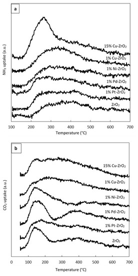 NH3-TPD and CO2-TPD experiments were carried out to investigate the acid–base properties of the reduced catalysts. Figure 3a shows the NH3-TPD profile of pure ZrO2, and the catalysts with different reduced metals (Cu, Ni, Pd, and Pt) loaded on the ZrO2, as well as the Cu–ZrO2 catalysts with different Cu loadings. Figure 3b displays the CO2-TPD profile for the same catalysts.