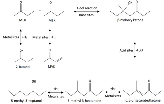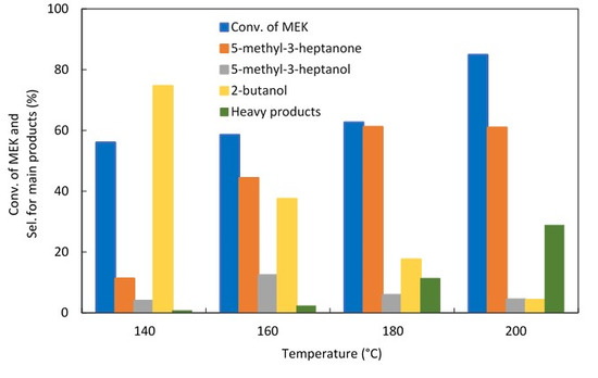 The coupling reaction of small molecules to produce large molecules is a commercially attractive method to form a range of products with specific structures and properties. For this reason, this work utilizes aldol condensation for upgrading MEK to heavier ketones. MEK is an attractive feedstock, as it can be derived from renewable resources, for example, by dehydrating 2,3 butanediol (2,3 BDO) [17,18,19,20,21,22,23,24], which can be produced at a high yield from biomass-derived sugars [25,26,27,28,29,30,31,32]. The process studied includes a single step to create C–C bonds between MEK via heterogeneous catalysis, using a multifunctional catalyst having aldol condensation (aldolization and dehydration) and hydrogenation properties, to produce a heavier ketone (C8) in a single reactor. The main product, 5-methyl-3-heptanone, is an important intermediate used to produce heavier aliphatic alcohol (5-methyl-3-heptanol) via a hydrogenation reaction. It can also be used to produce C8 alkenes and C8 alkanes for use as a fuel by hydrogenation–dehydration reactions.