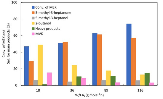 The conversion of MEK and the selectivity for the products were calculated using Equations (1) and (2), respectively, as follows: