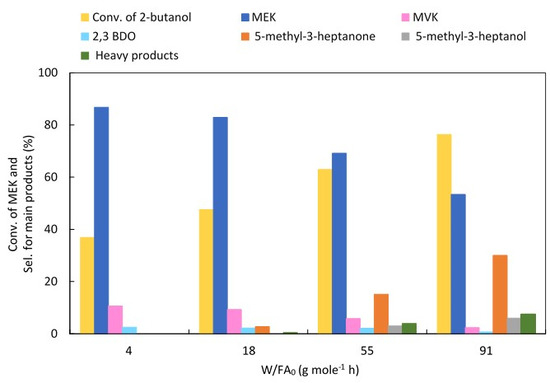 The results in Figure 6 could be interpreted to imply that 2-butanol is a key intermediate in producing C8 ketones; 2-butanol is the most prevalent product at low space times, but its selectivity decreases as the space time increases, in favor of 5-methyl-3-heptanone. It is possible that the C8 ketone results from the Guerbet condensation [48,49] of 2-butanol, followed by the dehydrogenation of C8 alcohol. For these reasons, the reaction of 2-butanol on 15% Cu–ZrO2 was carried out with different space times. As can be seen from Figure 7, the conversion of 2-butanol increases from 37% to 76% with the increasing space times from 4 to 91 g mol−1 h. However, the selectivity of MEK produced from the dehydrogenation of 2-butanol decreases with the increasing space times, from 87% to 53%, and is associated with increasing the C8 ketone from 0% to 30%. This suggests that MEK is responsible for producing the C8 ketone instead of obtaining the C8 ketone from 2-butanol directly via Guerbet condensation. It is also important to note that at low space times, where mainly primary reactions should occur, no C8 ketones or alcohols were detected. MVK and 2,3 BDO were detected at low space times, as a result of the dehydrogenation and hydration of MEK, respectively, and both decreased with increasing space times.