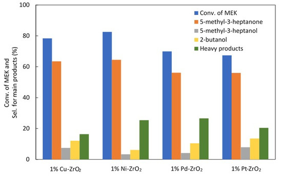Different metals (Cu, Ni, Pd, and Pt) supported on ZrO2 were investigated in this work, in order to see the effect of the metal identity on the catalytic performance. The conversion of MEK and the selectivity of the main products’ results gathered after 1 h from the reaction using 1.0 g of the catalyst are shown in Figure 8.