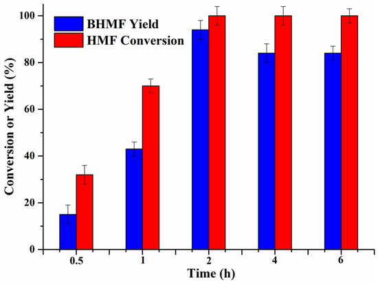 The effect of reaction time on the reduction of HMF into BHMF. (Reaction conditions: HMF (0.5 mmol), K2CO3 (0.1 mmol), Ph2SiH2 (1.4 mmol H−), MTHF (2 mL), and 25 °C; After the reaction, 3 mL methanol was added into the resulting mixture, followed by stirring under ambient conditions for 30 min.)