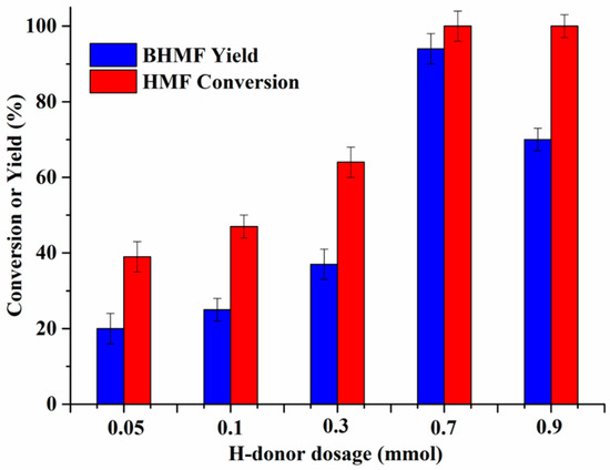 The Ph2SiH2 dosage was found to have a significant effect on BHMF synthesis, as shown in Figure 4. As the dosage of Ph2SiH2 rose from 0.05 to 0.7 mmol, the yield of BHMF was observed to increase from 20.0 to 94.2%, accordingly. Nevertheless, when the PMHS dosage was more than 0.7 mmol, the BHMF yield was decreased despite constant HMF conversion. The decline in the yield of BHMF was most likely caused by the reaction of excessive Ph2SiH2 with potassium carbonate and BHMF to form cross-linked siloxanes that are too stable to hydrolyze even proceeding post-treatment with methanol. In a word, the use of 0.7 mmol Ph2SiH2 was favorable to attain the highest BMHF yield at 25 °C for 2 h in MTHF.