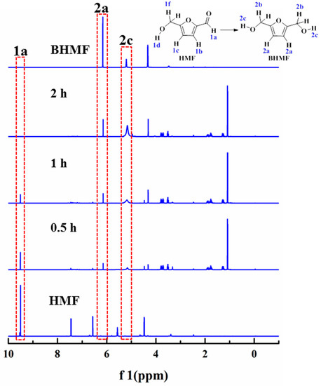 To explicitly interpret the reaction mechanism for hydrogenating HMF to BHMF, ex situ 1H NMR spectra were recorded at 25 °C in the time course of 0.5–2 h, see Figure 6. The aldehydic proton 1a of HMF gradually disappeared, while the protons of hydroxyl 2c and methine of the furan ring 2a of BHMF were also detected and significantly enlarged by further extending the reaction duration. The mechanism for the hydrogenation of aldehydes or ketones catalyzed by K2CO3 was thus proposed to be very similar to the reduction process of amides [53], where Ph2SiH2 might act as an H-donor to promote the reduction of HMF to BHMF, as demonstrated by in situ NMR in our previous study [39]. The possible reaction mechanism of the hydrogenation of HMF to BHMF is shown in Scheme 1. Initially, the interaction of a Lewis base (carbonate) and Ph2SiH2 forms a high-valency silicate species, which is a nucleophile in nature [54] and can activate the aldehyde group by hydride transfer to afford the siloxane intermediate, followed by hydrolysis to give BHMF. This catalytic system is simple to operate and does not produce observable byproducts during the reduction process, compared with other previous reaction systems [26,27].