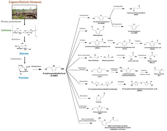 - Routes through 5-HMF as a building block for further transformations to furan-based products. Such pathways require prior isomerization of glucose to fructose, from which 5-HMF can be produced. Figure 2 presents a scheme of a number of products and intermediates in some cases that can be synthesized via pathways from 5-HMF starting from glucose through isomer fructose. Additionally, this figure also shows the derivation of glucose from lignocellulosic material.