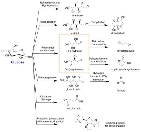 The present section will focus on works reporting the exploitation of glucose to obtain value-added products and fuels of renewable origin through different catalytic procedures. For the valorization of this material, two types of transformations can be identified: