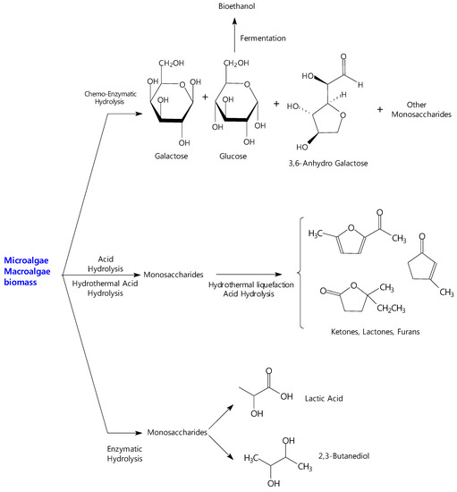 - Lee, S.B.; Kim, S.K.; Hong, Y.K.; Jeong, G.T. Optimization of the production of platform chemicals and sugars from the red macroalga, Kappaphycus alvarezii. Algal Res.-Biomass Biofuels Bioprod. 2016, 13, 303–310. [Google Scholar] [CrossRef]