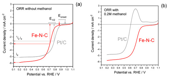 Typical oxygen reduction reaction (ORR) curves obtained using the rotating disk electrode (RDE) technique. (a) Comparison in the absence of methanol and (b) in the presence of methanol (0.2 M). The Pt/C catalyst was 40 wt % Pt/C from Johnson Matthey, and the platinum-group metal (PGM)-free catalyst was Fe–N–C from reference [44]. All of the curves were obtained in an O2-saturated 0.5 M H2SO4 aqueous electrolyte, at room temperature, with 50 µg cm−2 for Pt and 600 µg cm−2 for Fe–N–C, and a 5 mV s−1 scan rate at 1600 rpm.