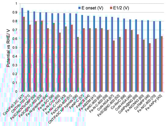 Remarkable results were obtained with Fe3C-based materials [50,53], showing an onset potential of 0.91 V [50] and 0.9 V [53], with E1/2 of about 0.8 V for both catalysts.