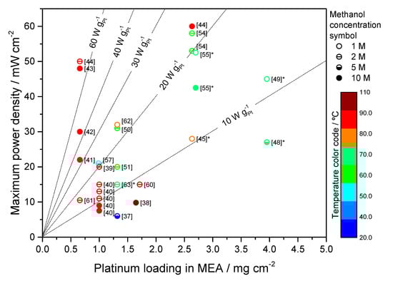 Taking into account all of these discussed aspects together, the PGM-free catalysts appear as a very promising formulation for cost-effective DMFC systems, in which Pt and PGM catalysts can be completely removed from the cathode, and a low loading PtRu catalyst may be employed at the anode. This is summarized in Figure 3, where the maximum power density is represented against the Pt content in the MEA, considering that it is only present at the anode as a PtRu catalyst. Performances larger than 60 W gPt−1 can be reached even with a high methanol concentration of 10 M, thanks to their extraordinary tolerance to methanol. This means that it is preferred to employ the most expensive metal, Pt, only at the anode, in order to take advantage of the methanol-tolerant properties of M–N–C catalysts at the cathode and to design systems with prolonged operation (high methanol concentration). In fact, they have even shown good performance for DMFC fed with 17 M methanol [60], where the Pt cathode shows a large activation loss. As this value (17 M) is close to the stoichiometric one for the fuel with water, this condition maximizes the system energy capacity.