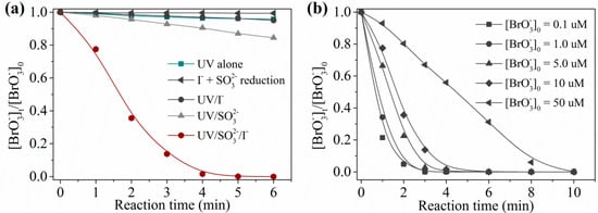 Firstly, a comparison test of UV alone, sulfite/, UV/, UV/sulfite, and UV/sulfite/ processes was conducted to explore the efficiency and advantages of the UV/sulfite/ process in degradation. To exclude the interference of the water matrix in real water, these comparison experiments were carried out in prepared water (bromate-containing water prepared with deionized water). As shown Figure 1a, under aerobic conditions ([DO]0 = 7.0 mg·L−1), 10 μM was degraded slowly using the UV/sulfite process or UV/ process, but completely disappeared within 5 min using the UV/sulfite/ process at 20 °C. As a comparison, direct UV photolysis and sulfite/ reduction showed a slow degradation rate, which can be attributed to the weak absorbance at 254 nm for [10] and low reduction potential of sulfite/ (E(/) = 0.535 V, and E(S(VI)/S(IV)) = −0.94 V [19]). Figure 1b presents the degradation curves of at different initial concentration ([]0) using the UV/sulfite/ process. Without exception, concentrations ranging from 0.1–50 μM were completely removed within 10 min. Generally, the degradation rate decreased with increased []0. Notably, 0.1 μM (World Health Organization (WHO) guideline value) could be degraded thoroughly within 3 min. One can expect a complete removal of in seconds if a UV lamp with higher power (such as 100 W) is used.