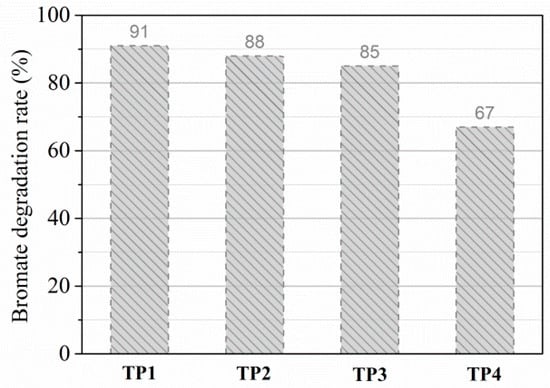 Bromate () is considered as a carcinogen, and is produced during bromide-containing water treatment processes including chlorination, ozonation, and advanced oxidation [1]. It is of great importance to remove the formed in drinking water due to its carcinogenic risk. Notably, once is generated in the disinfection unit of a drinking water plant, there are limited steps to prevent the occurrence of in tap water. One solution is to install household water purifiers to remove . The small site occupancy for household water purifiers means that the technologies adopted must remove within a short contact time and at high operational cost. The methods of degrading from drinking water include activated carbon or resin adsorption [2], electron beam irradiation [3], membrane separation [4], biological reduction [5], zero-valent iron (ZVI) reduction [6], photo [7] or photocatalytic reduction [8], layered double hydroxide reduction [9], advanced reduction processes (ARPs) [10], and so on. Among these technologies, hydrated electron ()-based ARPs distinguished themselves in degradation due to the high rate constants between and (~109 M−1·s−1) [10,11]; thus, they show potential for their use in household drinking water purifiers, which are characterized by a small hydraulic retention time.