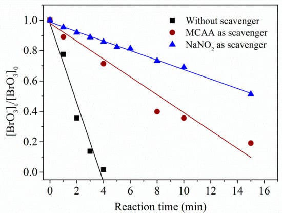 Degradation of using UV/sulfite/ process in the presence of monochloroacetic acid (MCAA) and . Conditions: []0 = 10 μM, []0 = 100 μM, [sulfite]0 = 1.0 mM, [MCAA]0 = 1.0 mM, []0 = 4.0 mM, [DO]0 = 7.0 mg⋅L−1, pH = 9.2, 20 ± 1 °C.