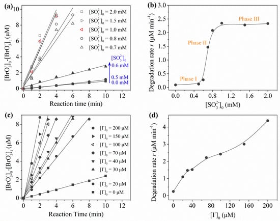 By fitting the degradation curves of using the UV/sulfite/ process, pseudo zero-order kinetics was found to be followed. Figure 4a shows that degradation improved with increased [sulfite]0. Figure 4b reveals three distinct phases for the influence of sulfite dosage. The degradation rate of (r) accelerated slightly from ~0.10 μM·min−1 to 0.12 μM·min−1 (phase I) by 0.5 mM sulfite, and a further increase of sulfite concentration caused a remarkable linear enhancement (phase II). However, much higher sulfite dosage (1.5–2.0 mM) only brought subtle increases of rate constants (phase III), which may be explained by the fact that incident photons were in short supply and obvious self-quenching of radicals occurred.