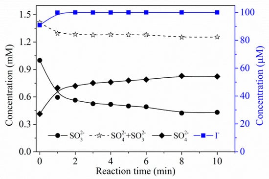 Regarding the role of , one can find that a concentration change at the 10 μM level would result in a significant variation in degradation efficiency of (Figure 4c). Comparing the two linear relationships in Figure 4b,d, the degradation efficiency was about 5.6 times (normalized to molar concentration) more dependent on than on sulfite. Thus, may play an important role in the process. Figure 5 presents the simultaneous evolution of sulfite and during the degradation of . Sulfite decreased rapidly within the first 2 min and then slowly depleted, while almost stayed constant as long as sulfite was available. The UV photolysis mechanism of is shown in No. (6)–(12) in Table 2. Iodide was a stronger UV-absorber at 254 nm compared to sulfite and had a higher quantum yield than sulfite [17]. However, the UV/ process failed to show superior reduction efficiency compared to the UV/sulfite process due to the scavenging effect of by the photogenerated RISs and self-consumption of (No. (5)–(14) in Table 2). The nearly constant concentration of indicated that the presence of sulfite may inhibit negative effects of RISs and promote the regeneration of . Based on the above discussion, one can conclude that mainly served as an precursor, while sulfite not only played a role as an precursor, but also as an RIS shielding agent and a regenerant of . Considering the negligible chemical change of during the whole reaction, acted similarly to a catalyst.