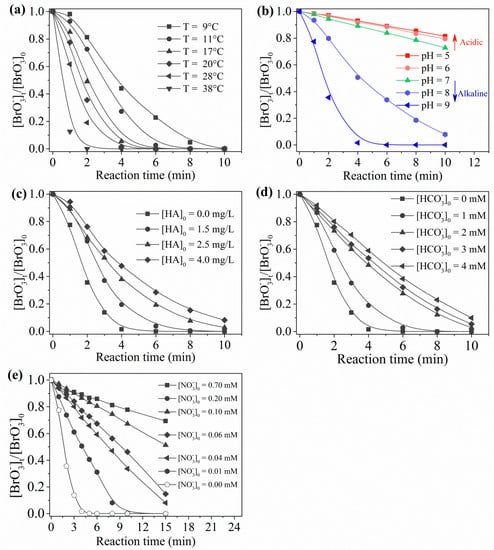 Influence on water quality parameters with regards to the degradation of using the UV/sulfite/ process: (a) temperature; (b) pH; (c) humic acid (HA); (d) ; (e) . Conditions: []0 = 10 μM, []0 = 100 μM, [sulfite]0 = 1.0 mM, [DO]0 = 7.0 mg·L−1, pH = 9.2, 20 ± 1 °C.