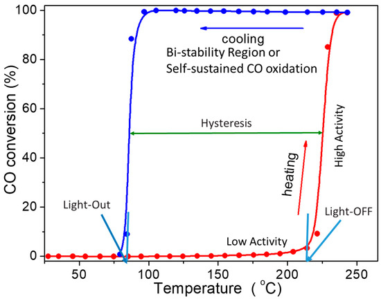 During ignition (light-off) and extinction (light-out) exothermic CO oxidation reactions, hysteresis can occur during the conversion as a function of temperature. Consequently, a hysteresis loop can appear because of a mismatch between the activity during the ignition and extinction processes. There are three regions of activity observed: the first region has low activity (before the light-off temperature), where CO is adsorbed on a catalyst surface, followed by a region with high activity at a higher temperature (after the light-off temperature) and finally, a region of bi-stability before the light-out temperature, as shown in Figure 1.