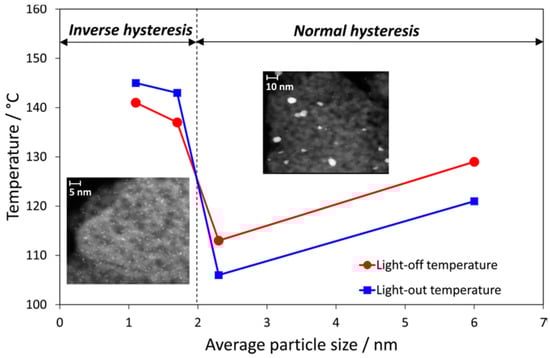 Light-off and light-out temperatures vs. average Pt particle size during CO oxidation [94].