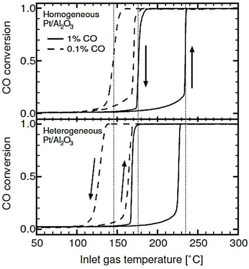 Carlsson et al. have studied oxidation of CO mixture in excess oxygen over Pt/Al2O3 and Pt/CeO2 catalysts with the platinum phase distributed either homogeneously or heterogeneously in the support material using temperature-programmed experiments [5]. It has been found that the hysteresis width increases with decreasing CO concentrations, and at 0.1% CO, hysteresis is significantly broader for the heterogeneously distributed platinum catalysts compared to the homogeneously distributed Pt catalysts, as shown in Figure 5.